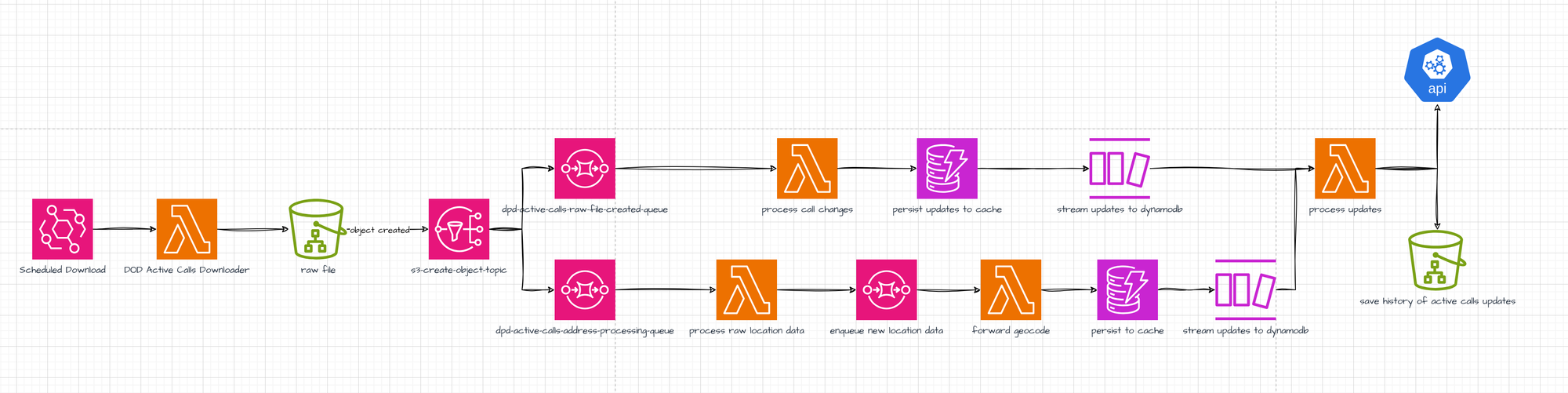 - A lambda function downloads the current snapshot of active calls from Dallas Open Data, and saves the raw json to an s3 bucket based on an eventbridge schedule.