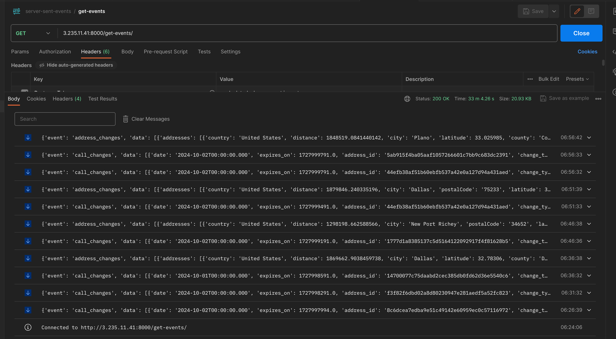 The API prototype was built using python's FastAPI framework. It runs in a docker container hosted on AWS' Elastic Container Service (ECS). Its methods allow fetching the most recent active calls with enriched location details, and streaming real-time updates to the client. When a new client connects, it will download all current calls, and then subscribe to /get-events/ to receive streaming updates for calls and address information.